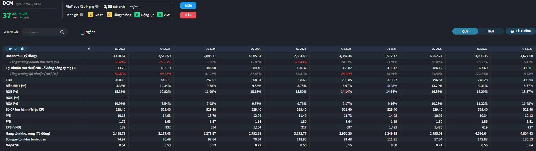 - DCM ghi nhận KQKD Q4/2025 ổn định với doanh thu đạt khoảng 4.627 tỷ đồng, tăng nhẹ YoY và cải thiện rõ so với Q3/2025 nhờ sản lượng tiêu thụ phục hồi và mặt bằng giá phân bón duy trì ở mức hợp lý. LNST Q4/2025 đạt khoảng 390 tỷ đồng, tăng so với cùng kỳ và duy trì nền lợi nhuận cao, dù không còn đột biến như các quý cao điểm trong chu kỳ giá phân bón. Lũy kế năm 2025, DCM tiếp tục duy trì hiệu quả sinh lời tốt với ROE xấp xỉ 18–19%, biên EBIT quanh 9–11%, phản ánh năng lực kiểm soát chi phí và lợi thế đầu vào khí. Trong bối cảnh chu kỳ phân bón đã qua đỉnh nhưng chưa bước vào pha suy giảm sâu, lợi nhuận của DCM được kỳ vọng duy trì ổn định; với P/E quanh 10x và P/B ~1,8x, cổ phiếu phù hợp với chiến lược nắm giữ trung hạn, ưu tiên yếu tố phòng thủ và dòng tiền hơn là kỳ vọng tăng trưởng đột biến.