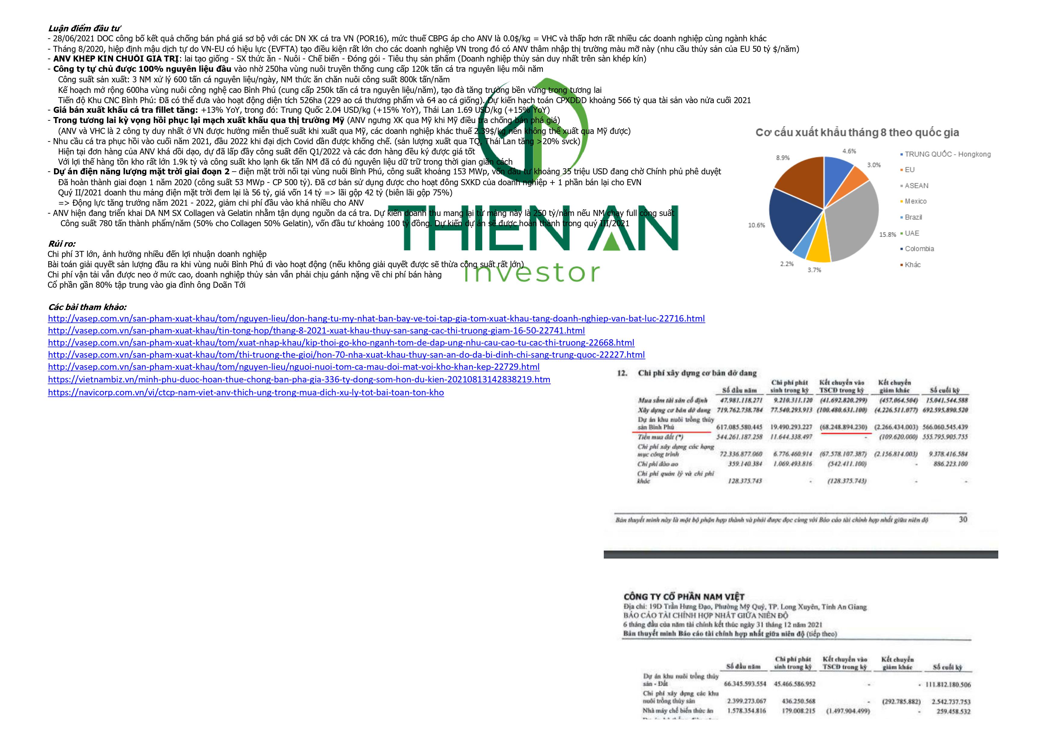 28/06/2021 DOC công bố kết quả chống bán phá giá sơ bộ với các DN XK cá tra VN (POR16), mức thuế CBPG áp cho ANV là 0.0$/kg = VHC và thấp hơn rất nhiều các doanh nghiệp cùng ngành khác. Tháng 8/2020, hiệp định mậu dịch tự do VN-EU có hiệu lực (EVFTA) tạo điều kiện rất lớn cho các doanh nghiệp VN trong đó có ANV thâm nhập thị trường màu mỡ này (nhu cầu thủy sản của EU 50 tỷ $/năm)