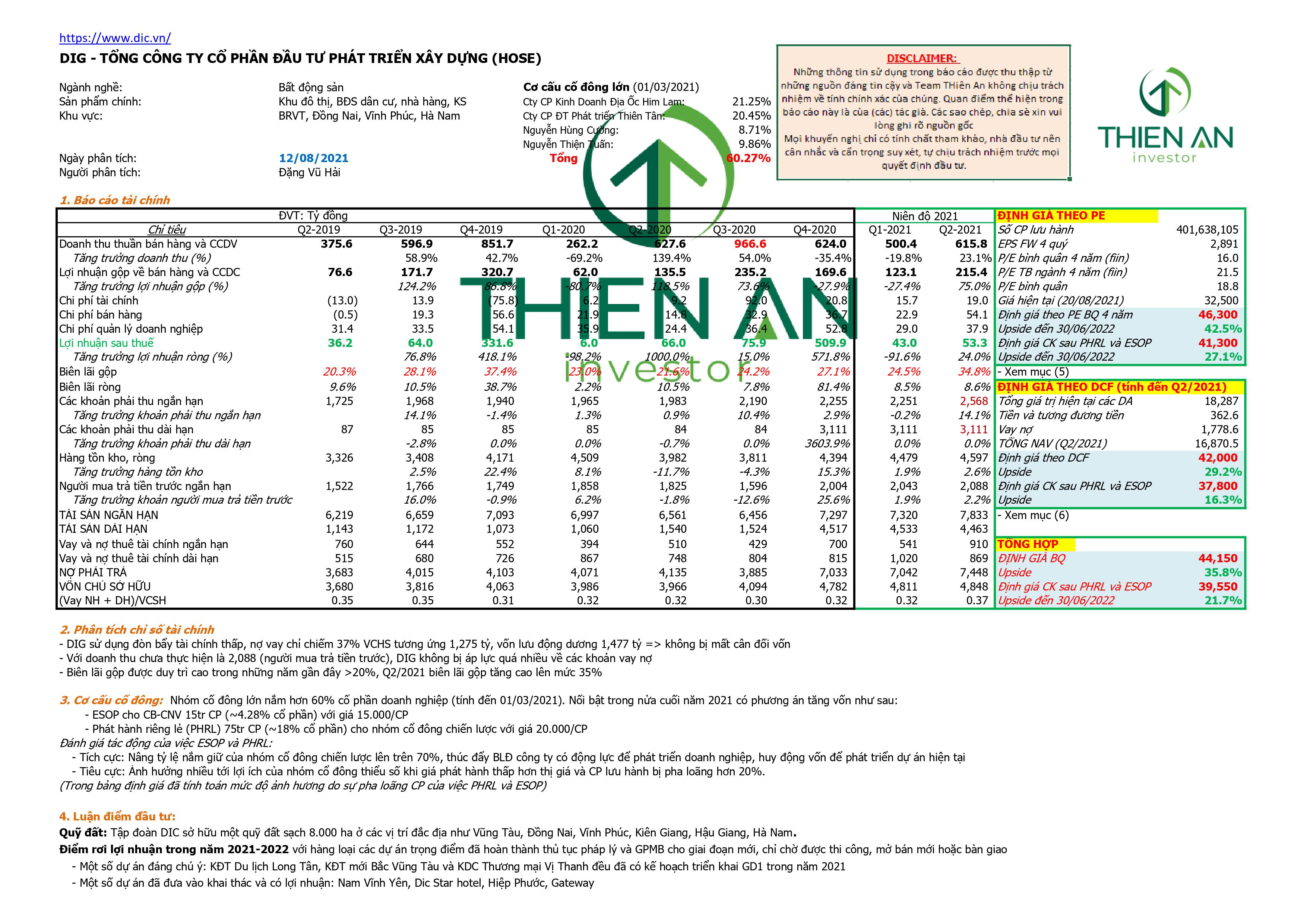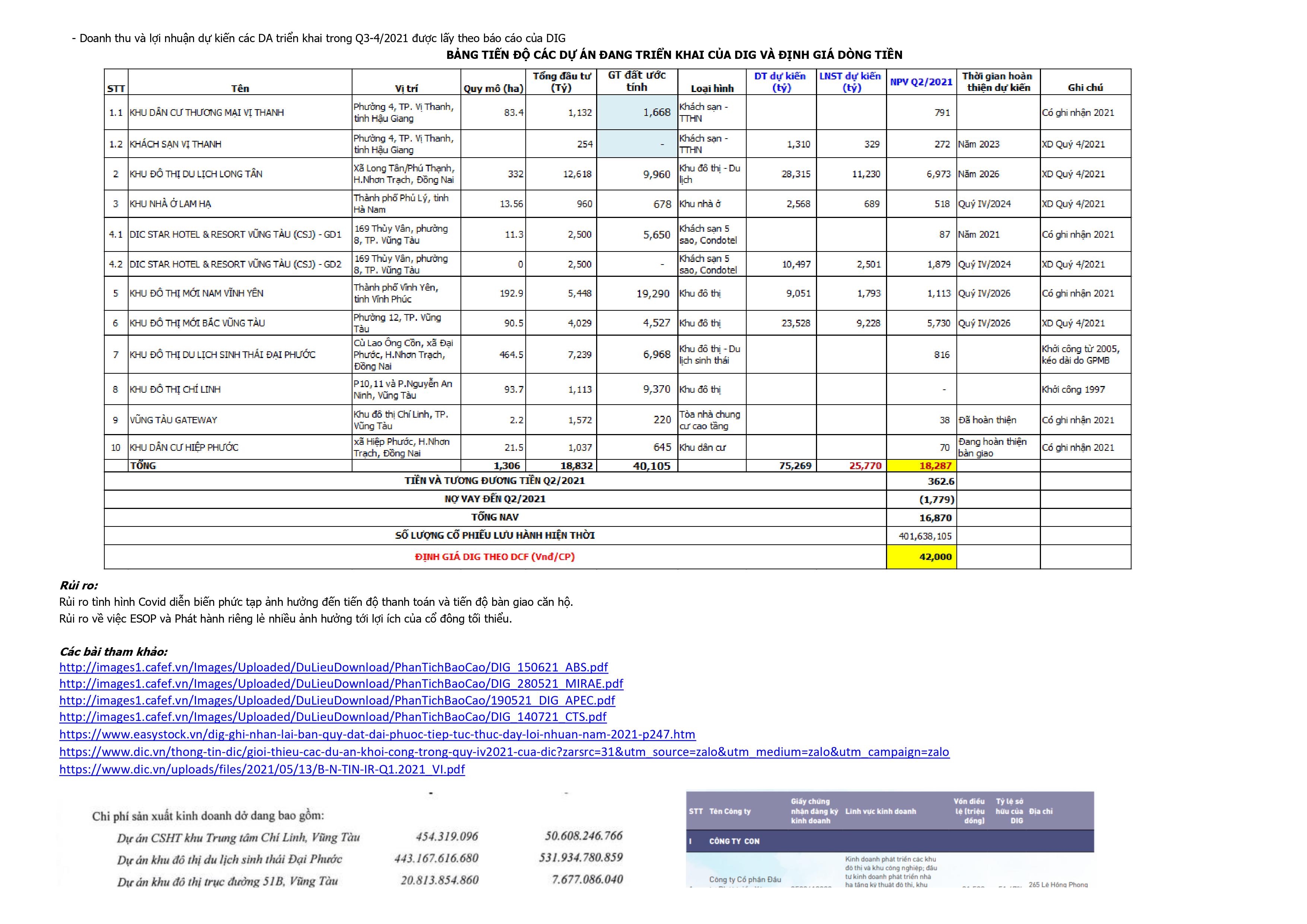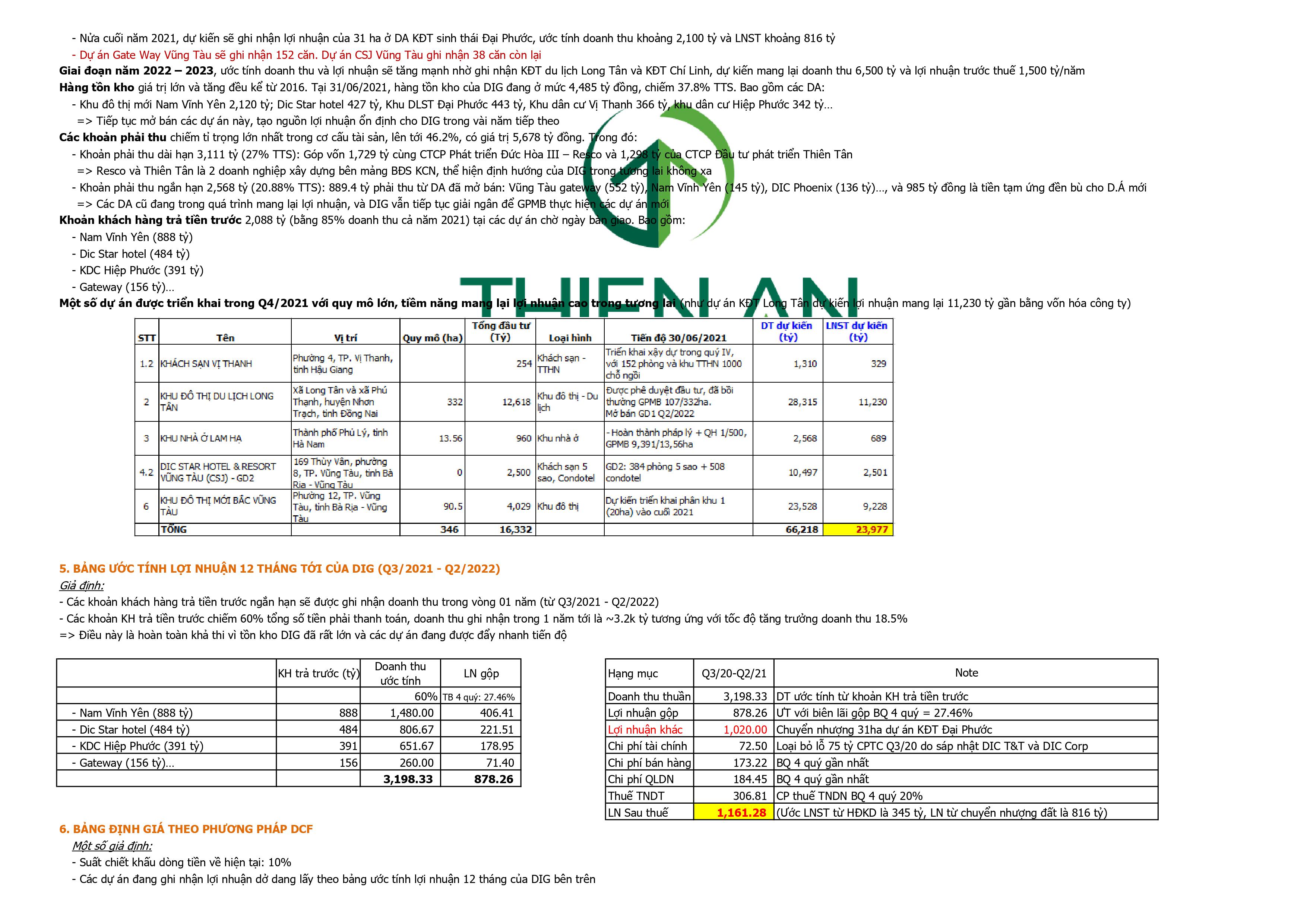 Tập đoàn DIC sở hữu một quỹ đất sạch 8.000 ha ở các vị trí đắc địa như Vũng Tàu, Đồng Nai, Vĩnh Phúc, Kiên Giang, Hậu Giang, Hà Nam. Một số dự án đáng chú ý: KĐT Du lịch Long Tân, KĐT mới Bắc Vũng Tàu và KDC Thương mại Vị Thanh đều đã có kế hoạch triển khai GD1 trong năm 2021.