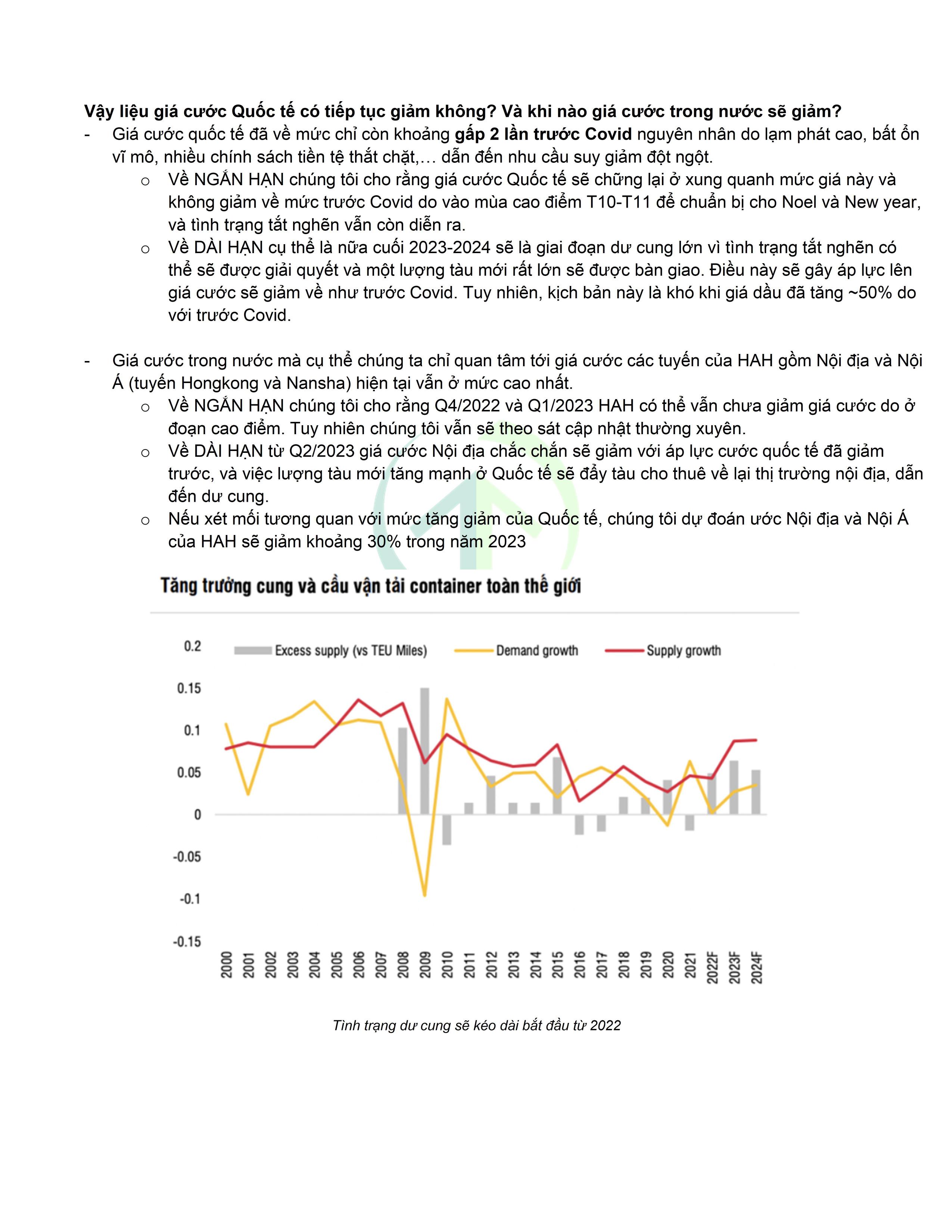Tàu HAH hoạt động chủ yếu Nội địa và Nội Á (Đi Hongkong và Nansha) vì vậy công suất có thể vẫn duy trì tốt. Hoặc có thể tăng khi có thêm tàu mới vào cuối 2023 dù không đáng kể... Đội tàu HAH sau khi gia tăng chiếm tới 39% tổng công suất cả nước.
