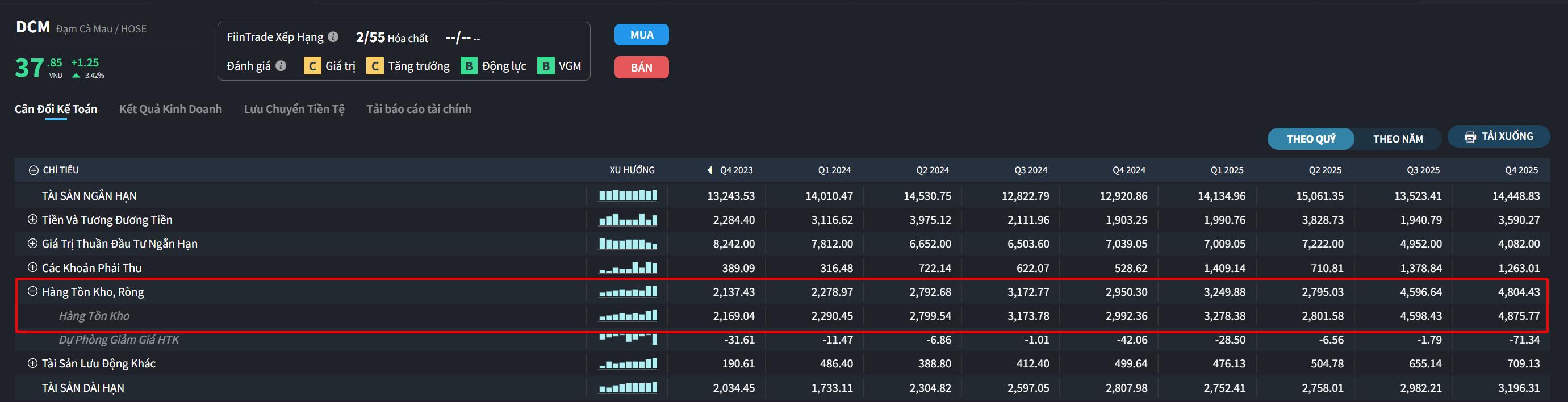 - Trong BCTC Q4 của DCM, đáng chú ý là HTK tiếp tục neo cao quý thứ 2 liên tiếp, tăng 60% svck, chủ yếu là thành phẩm/hàng hóa. Có thể tồn hàng chưa bán đc, hoặc có thể để qua Q1 theo mùa vụ. HIện Urea chiếm khoảng 50% doanh thu; còn lại là NPK và phân bón, xuất khẩu chiếm 25%, chủ yếu là xuất Urea Giá Urea hiện tại đang ở mức 12.500, cao hơn cùng kỳ năm ngoái khoảng 10%.