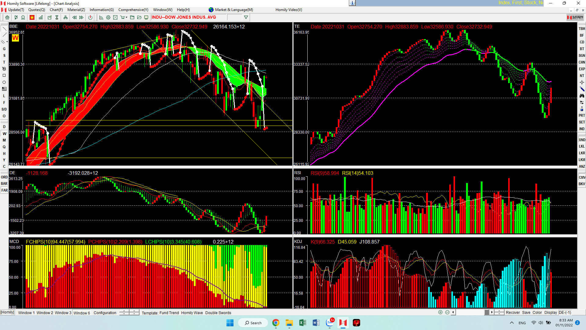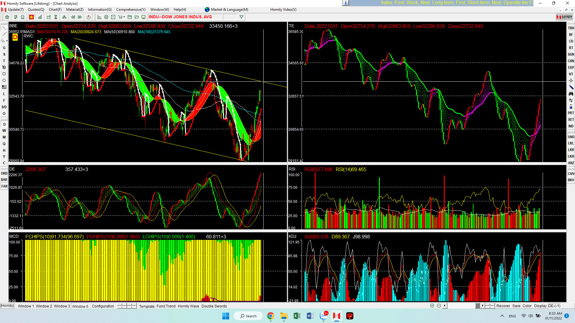 - Đồ thị tuần: cũng quá mua; các chỉ báo dòng tiền đều tích cực. ĐIỀU QUAN TRỌNG NHẤT là giá đã vượt khỏi mây BBE TUẦN, trong lịch sử mỗi lần giá vượt mây BBE tuần thì đều uptrend dài hạn rất là lâu (tất nhiên là trong quá trình đó sẽ có 1 nhịp hạ nhiệt về chạm vào BBE và BBE hỗ trợ được), nên trong bối cảnh sắp tới rất nhiều kỳ vọng DJ sẽ uptrend, cơ mà thật sự khó nói khi mà bối cảnh kinh tế 2023 đứng trước mối lo suy thoái vào tầm đoạn cuối năm 2023 => biết đâu, từ giờ tới đoạn cuối năm 2023 thì tt sẽ uptrend vì đã chiết khấu xong vụ lãi suất, còn suy thoái sẽ là nhịp điều chỉnh trung hạn của năm sau