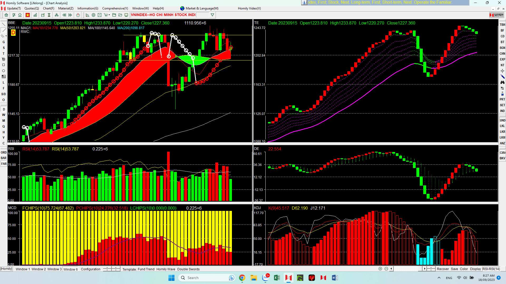 - Đồ thị Vnindex: Chart ngày, xu hướng dòng tiền đi ra và chỉ báo kDJ đang tiến dần về vùng quá bán (tầm 1-2 phiên nữa là sẽ quá bán). Dù vậy, điểm số không suy giảm nhiều mà biến động đi ngang trong vùng MA50 vùng biến động dự kiến: 1208-1243 (vùng 2 nến tiachi) Chart tuần: vận động xoay quanh MA200 tuần, chờ vượt nến tiachi tuần 1243 thì bước vào nhịp tăng mới! => trong tình huống xấu xí nhất thì vùng 1177 sẽ là hỗ trợ mạnh!