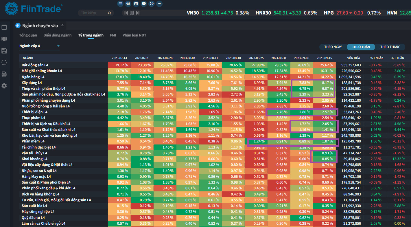 View tỷ trọng dòng tiền TUẦN - 18/09/2023: 1. Nhóm có tỷ trọng dòng tiền TĂNG sau khi về đáy tuần trước: Vận tải Thủy, Khai khoáng, Phân phối hàng chuyên dụng (Bán lẻ), Phân phối xăng dầu khí đốt. Trong đó nổi bật có nhóm Khai khoáng có mức tăng tốt nhất trong các nhóm ngành tuần trước - tăng 12,3% 2. Nhóm có tỷ trọng dòng tiền DUY TRÌ tích cực tuần vừa rồi: Nổi bật nhất là các nhóm liên quan đến Dầu khí với tỷ trọng tăng và giá tăng tốt nhất tuần. Tiếp đến nhóm Môi giới chứng khoán (tăng 2.8% tuần)- nhóm này cũng đã có tỷ trọng duy trì xanh 4 tuần liên tiếp và có tin hỗ trợ tuần vừa rồi. Ngoài ra còn một số ngành khác đã được gọi tên từ 2 tuần nay như: Xây dựng, Thép, Sản phẩm hóa dầu, Nông dược & Hóa chất khác, Phần mềm ... tuy nhiên lưu ý các nhóm này đều có mức giảm từ nhẹ đến -4% tuần trước. 3. Nhóm có tỷ trọng đang ở mức THẤP (duy trì dài màu đỏ trên 3 tuần nay) hoặc về ĐÁY 10 tuần: Ngân hàng, Nuôi trồng nông &hải sản, Thực phẩm, VLXD, Nhựa, cao su &Sợi, Hàng mau mặc, sản xuất và phân phối điện, Gỗ, Máy công nghiệp ...
