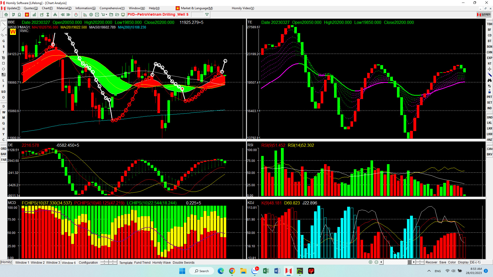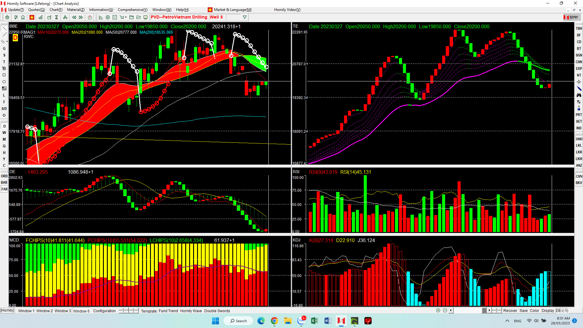 PVD nói riêng và dòng dầu khí nói chung hôm nay dự sẽ tích cực do giá dầu hồi phục mạnh hôm qua, vượt 20.2 sẽ cho mua LSF3, tuy vậy kháng cự mây BBE xanh dày trước mặt vùng giá 20.6-21.4 nên cả nhà có mua thì mua một chút thôi chứ ko nên mua nhiều khi cổ phiếu quá gần kháng cự mạnh. Chart tuần vẫn xấu và đang được hỗ trợ bởi BBE 20+-. ACE còn đăng nắm hàng thì có thể tham gia trading được rồi...