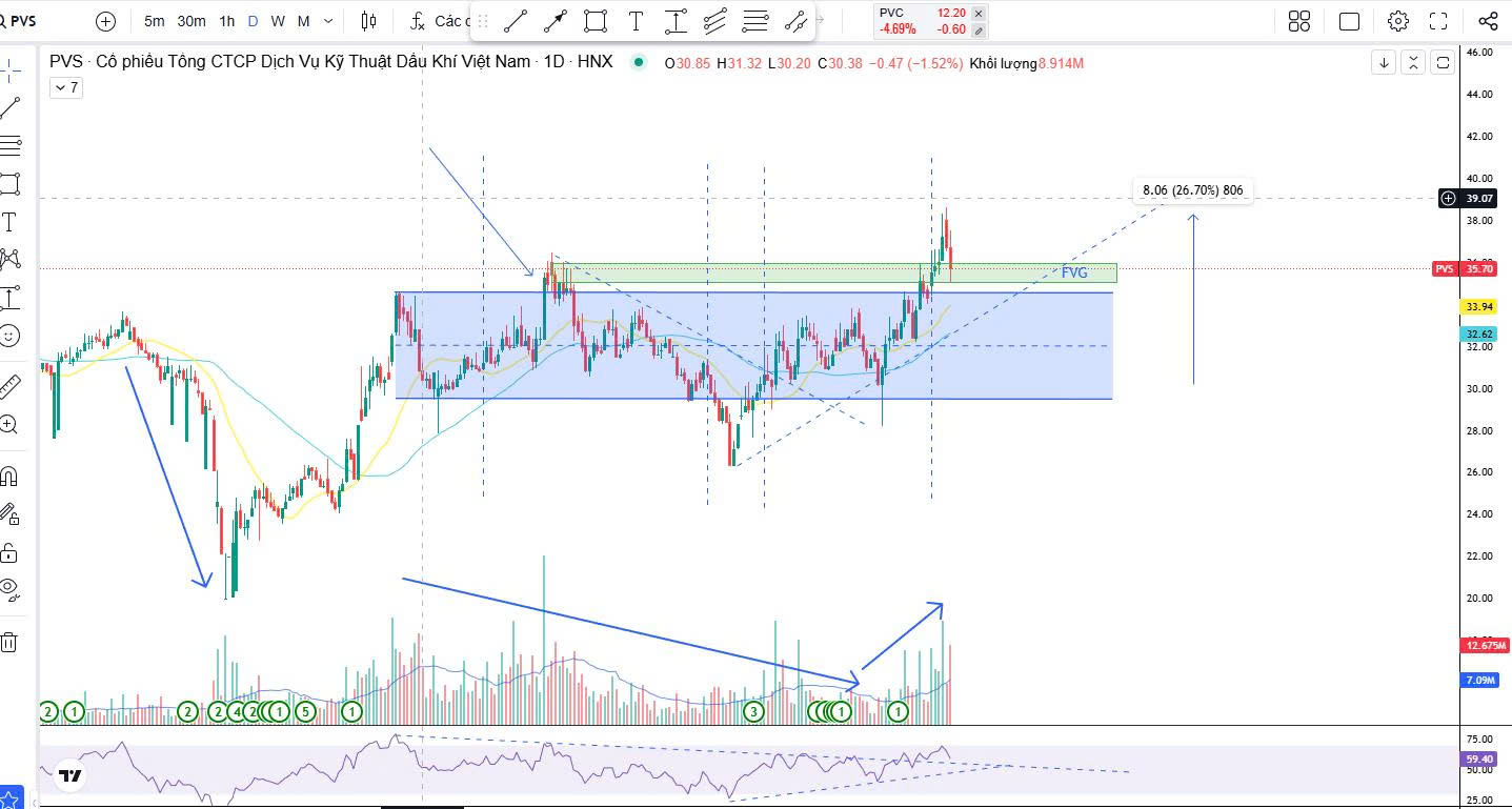 PVS có khả năng đang vào sóng E của đồ thị ngày, sau khi vượt 35.x; hiện tại đang test tại vùng FVG với vol tăng đột biến gần gấp 2 lần tb 20 phiên => dòng tiền đã vào.